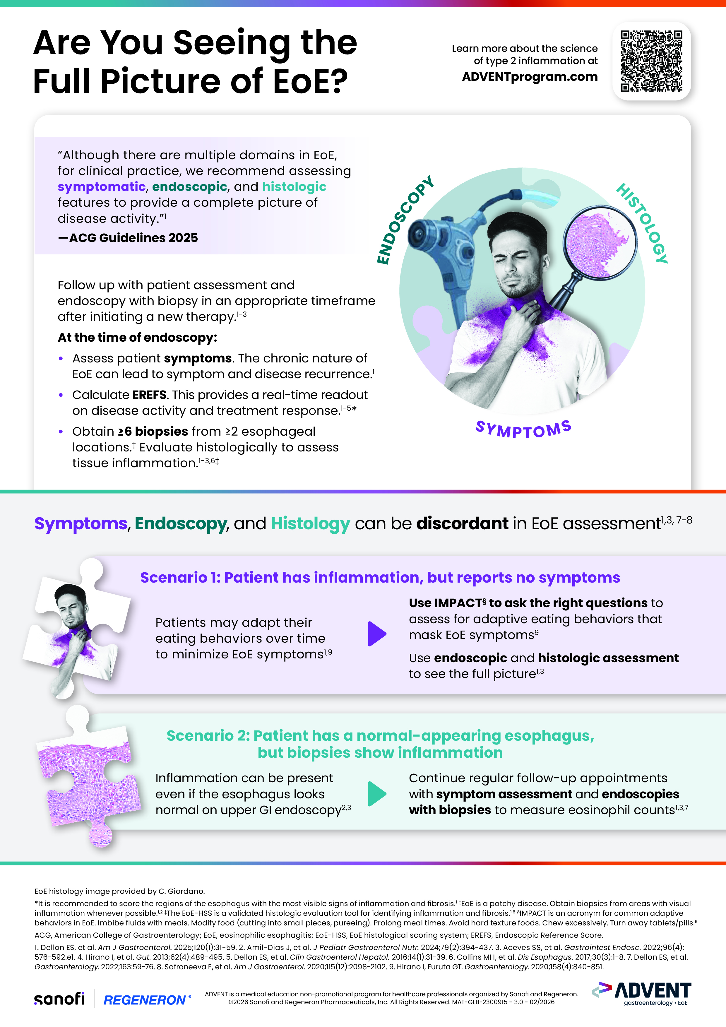Learn about the importance of assessing key disease domains in eosinophilic esophagitis (EoE) by focusing on patients' symptoms, QoL, endoscopy, and histology.